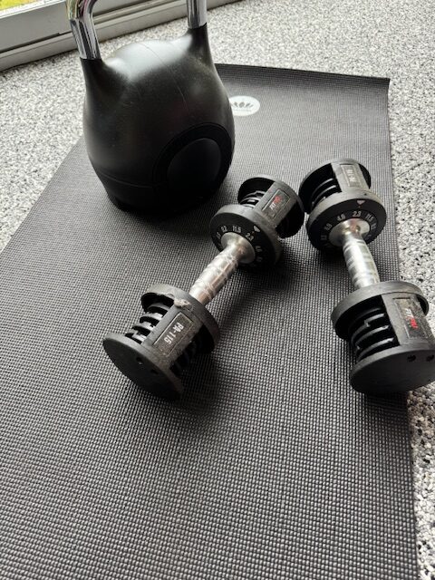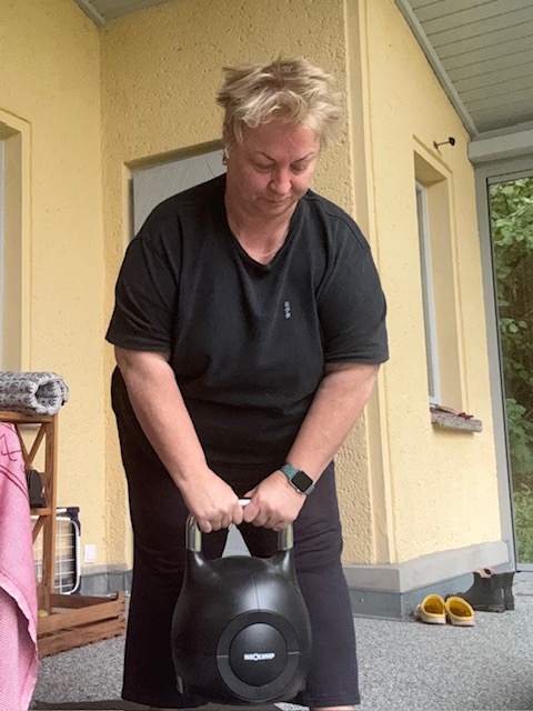 • Equipment: 1 Kettlebell (mittleres Gewicht), 2 Kurzhanteln (leicht bis mittel)